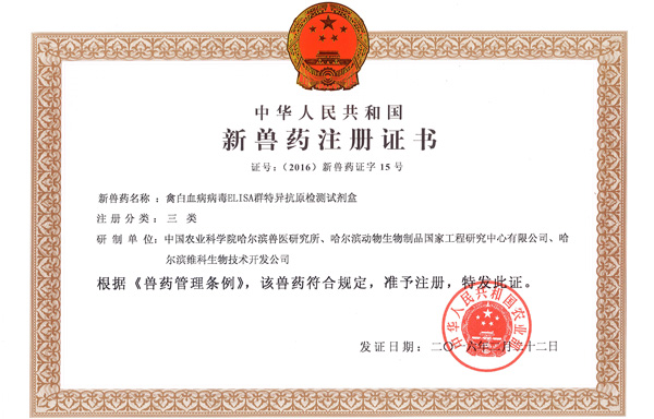 2016年2月25日,農(nóng)業(yè)部發(fā)部第2366號公告,由中國農(nóng)業(yè)科學(xué)院哈爾濱獸醫(yī)研究所(以下簡稱哈獸研)、哈爾濱動物生物制品國家工程研究中心有限公司(現(xiàn)更名為哈爾濱國生生物科技股份有限公司,以下簡稱工程研究中心)和哈爾濱維科生物技術(shù)開發(fā)公司3家單位聯(lián)合研發(fā)的禽白血病病毒ELISA群特異抗原檢測試劑盒,經(jīng)農(nóng)業(yè)部新獸藥審查合格,頒發(fā)新獸藥注冊證書(2016新獸藥證字15號)。該項(xiàng)目主要由中國農(nóng)業(yè)科學(xué)院哈爾濱獸醫(yī)研究所王笑梅研究員為首席的禽免疫抑制病團(tuán)隊(duì)研制,由工程研究中心承擔(dān)主要孵化工作,最終研制成功。該證書也是自工程研究中心成立后獲得的第2個(gè)新獸藥證書。
