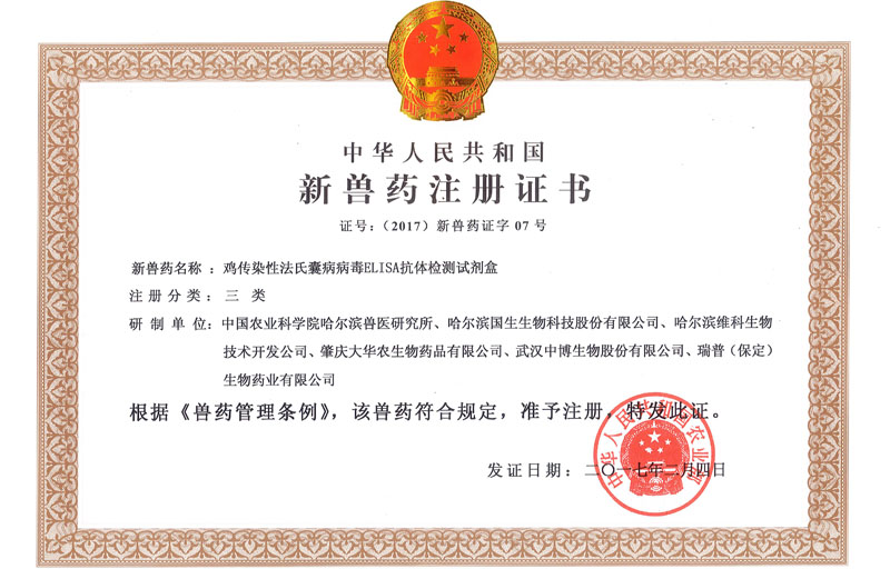 2017年2月4日,農(nóng)業(yè)部發(fā)布第2490號(hào)公告,由中國(guó)農(nóng)業(yè)科學(xué)院哈爾濱獸醫(yī)研究所(以下簡(jiǎn)稱哈獸研)、哈爾濱國(guó)生生物科技股份有限公司(動(dòng)物用生物制品國(guó)家工程研究中心,以下簡(jiǎn)稱國(guó)生生物)、哈爾濱維科生物技術(shù)開(kāi)發(fā)公司、肇慶大華農(nóng)生物制品有限公司、武漢中博生物股份有限公司和瑞普(保定)生物藥業(yè)有限公司6家單位聯(lián)合研發(fā)的雞傳染性法氏囊病病毒ELISA抗體檢測(cè)試劑盒,獲批新獸藥注冊(cè)證書(2017新獸藥證字07號(hào))。該產(chǎn)品由哈獸研王笑梅研究員為首席科學(xué)家的禽免疫抑制病團(tuán)隊(duì)研制,由國(guó)生生物承擔(dān)相關(guān)孵化工作。